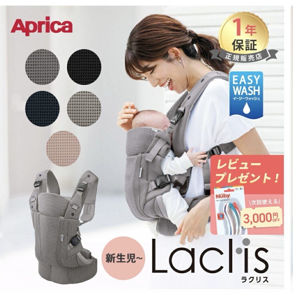 頂き物のエルゴを使ってみたら、しっくりきたようで泣き止んだので、ラクリスはもう少し大きくなったら使えるようになるかなと思います。